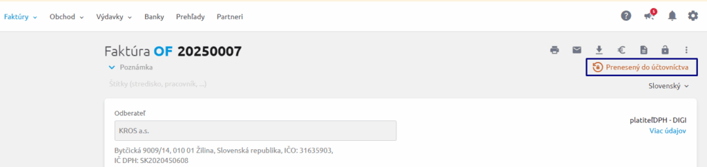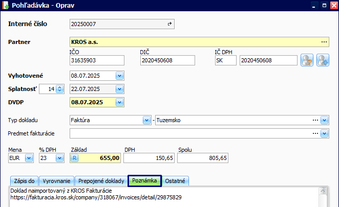 - V záložke Poznámka dokladu nájdete informáciu o tom, že tento doklad bol týmto spôsobom importovaný.