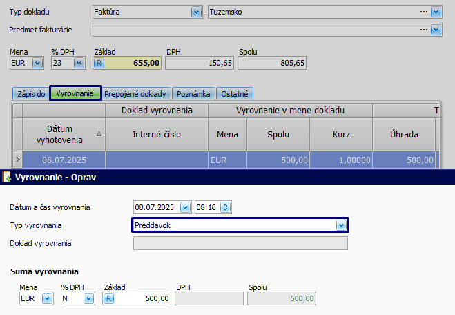 - Na záložke Vyrovnanie bude pridaný typ vyrovnania Preddavok.