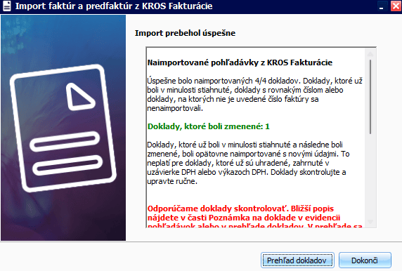 Po importe dokladov sa v programe ALFA plus zobrazí okno o úspešnom importe (informácia o tom, koľko dokladov bolo úspešne importovaných s krátkou poznámkou).