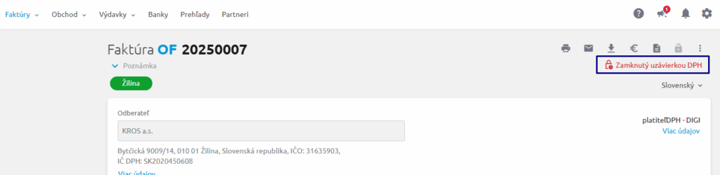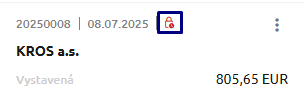 - Červený zámok – pred vykonaním uzávierky DPH je potrebné na dokladoch v KROS Fakturácii skontrolovať priradenie oranžového zámku. Priradenie oranžového zámku je potrebné skontrolovať z dôvodu, že program automaticky nekontroluje či všetky doklady za dané obdobie boli stiahnuté z KROS Fakturácie. Po vytvorení uzávierky DPH v ALFA plus cez Firma – Uzávierky a koniec roka – Uzávierka DPH sa v KROS Fakturácií automaticky zmení oranžový zámok na červený.