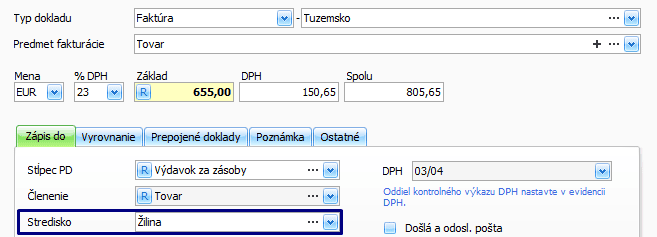 - V prípade, že sa v ALFE plus nachádza Stredisko, ktoré je zhodné s názvom štítku v KROS Fakturácii, automaticky sa prednastaví na importovanom doklade.