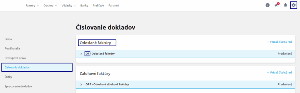 Kontrolu v KROS Fakturácii vykonáte cez Nastavenia (ozubené koliesko) v záložke Číslovanie dokladov.
