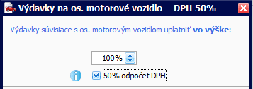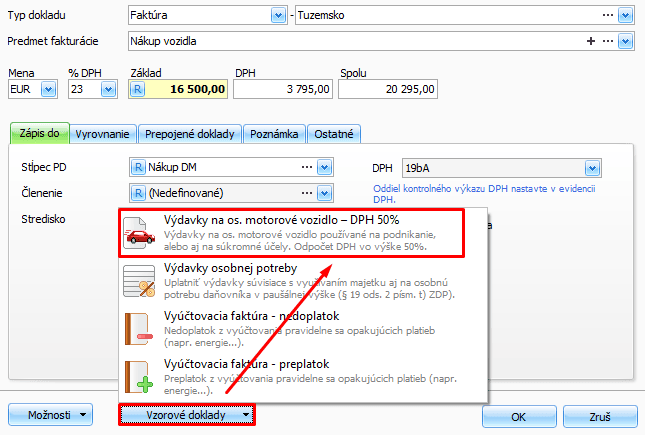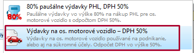 - Sumu rozúčtujete cez Vzorové doklady – Výdavky na os. motorové vozidlo – DPH 50 %: