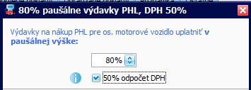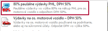 Ak podnikateľ nevedie knihu jázd, z pohľadu dane z príjmov si môže odpočítať len 80 % sumy (prípadne iné stanovené %). Pri evidovaní bločku je potrebné ručne nastaviť príslušné % (80 % alebo iný pomer). V tomto prípade odporúčame využiť preddefinovaný vzor Vzorové doklady – 80% paušálne výdavky PHL, DPH 50%.