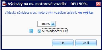 - Fakturovanú sumu je potrebné rozúčtovať z pohľadu dane z príjmov (100 %) a DPH (50 %). Rozúčtovanie nastavíte cez Vzorové doklady, kde vyberiete vzor Výdavky na os. motorové vozidlo – DPH 50 % a následne zvolíte príslušné %.