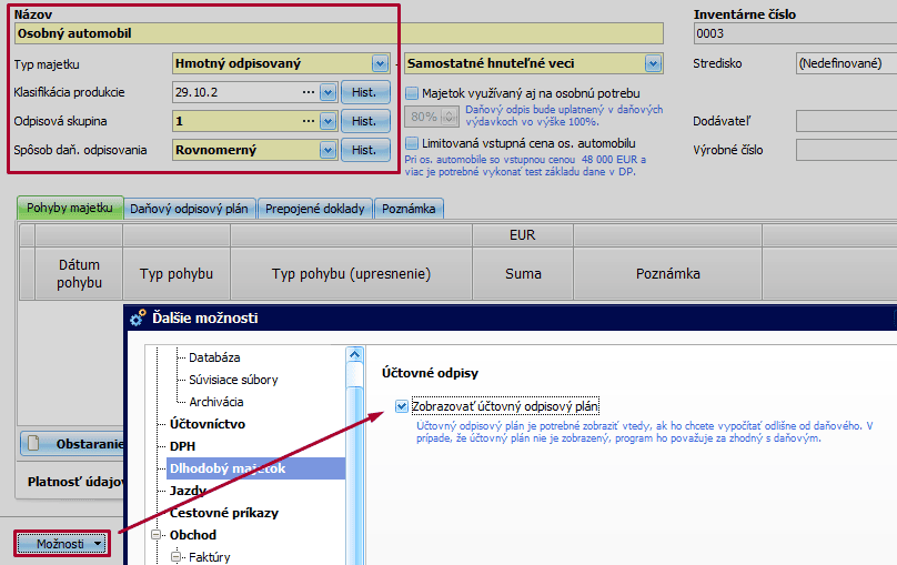 V prípade, že nemáte zobrazený Účtovný odpisový plán, zobrazíte si ho ešte pred zadaním pohybu Obstaranie cez Možnosti – Ďalšie možnosti – Zobrazovať účtovný odpisový plán.