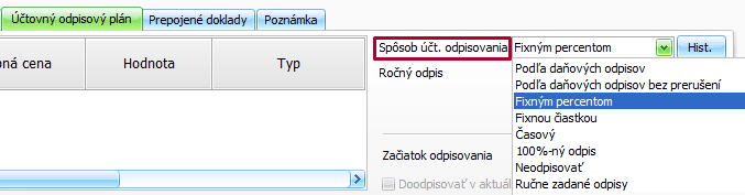 Z dôvodu, že daňová vstupná cena majetku (16 500 eur) je odlišná od účtovnej vstupnej ceny majetku (18 397,50 eur), na záložke Účtovné odpisy vyberieme iný spôsob odpisovania ako účtovné odpisovane = daňové odpisovanie, napr. Fixným percentom, fixnou čiastkou: