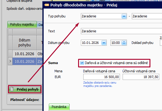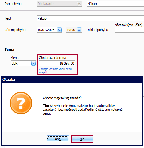 Na záložke Pohyby majetku pridáme pohyb Obstaranie a uvedieme obstarávaciu cenu majetku vo výške 18 397,50 eur (základ + 50 % neodpočítanej DPH). Zobrazenú otázku – „Chcete majetok aj zaradiť?“ odklikneme „Nie“. Následne ručne pridáme pohyb Zaradenie, zaklikneme voľbu „Daňová a účtovná vstupná cena sú odlišné“ a upravíme sumy daňovej a účtovnej vstupnej ceny: