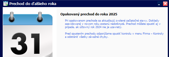 Prechod do nového roka je možné v programe ALFA plus vykonať opakovane, pričom sa aktualizujú prevádzané začiatočné stavy a všetky záznamy zaúčtované v roku 2025 zostanú zachované.