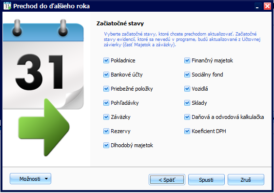 - v ďalšom kroku sa zobrazia všetky evidencie, z ktorých sa prenášajú začiatočné stavy do roka 2025. Odporúčame ponechať zakliknuté všetky voľby, prípadne zakliknite iba tie evidencie, ktoré chcete aktualizovať a kliknite na Spusti.