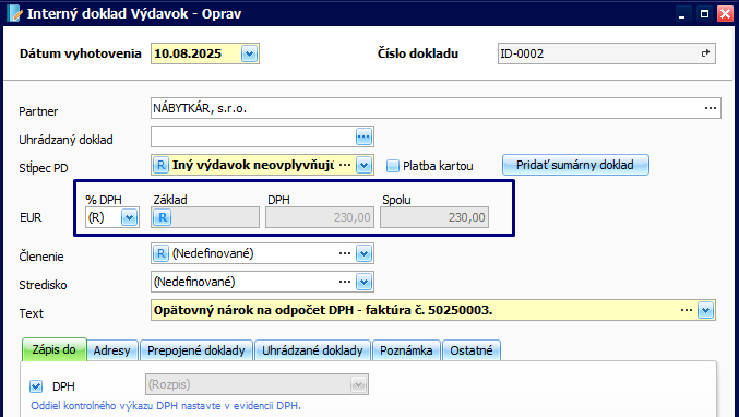 Nárok na opravu opravenej odpočítanej dane zaúčtujte cez Interný doklad – Výdavok. Stĺpec PD vyberte Iný výdavok neovplyvňujúci základ dane a doplňte partnera z neuhradeného záväzku.