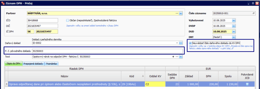Na zázname DPH zapnite voľbu: Neuvádzať číslo daňového dokladu do KV DPH (zapnutím voľby sa do kontrolného výkazu nedotiahne číslo zaúčtovaného interného dokladu, ale doplní sa údaj nula). Zároveň na zázname DPH doplňte P. č. pôvodného dokladu (číslo neuhradenej faktúry, z ktorej máte nárok na opravu už opravenej odpočítanej DPH).