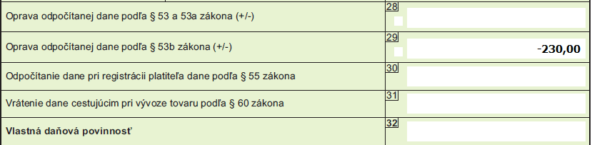 - V časti pre N-sadzbu DPH doplňte do bunky Spolu sumu neuhradeného záväzku bez DPH (sumu základu) mínusom. Formulár uložte.