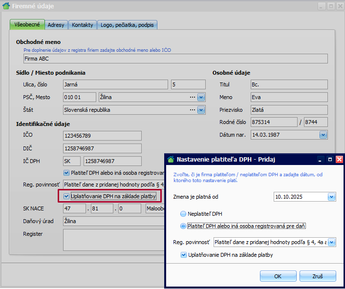 Ak daňovník spĺňa vyššie uvedené podmienky, v Alfe plus túto možnosť nastaví cez Firma – Nastavenia – Firemné údaje. V zobrazenom formulári zakliknite Uplatňovanie DPH na základe platby.