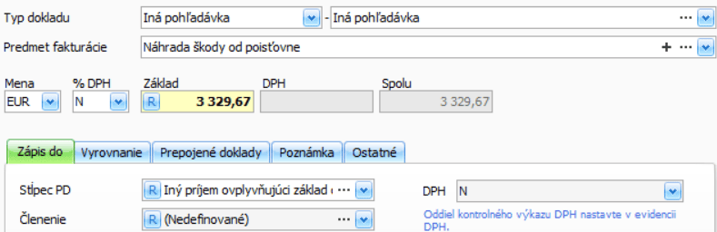 - sadzbu DPH vyberte N a doplňte sumu. Na záložke Zápis do vyplňte stĺpec PD, príp. členenie.