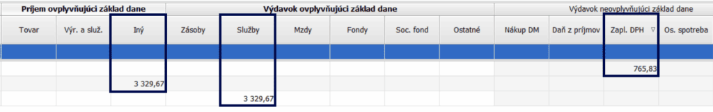 V peňažnom denníku bude prijaté plnenie vo výške 3 329,67 eur zaúčtované ako Príjem ovplyvňujúci základ dane v členení – Iný príjem ovplyvňujúci základ dane a zároveň aj ako Výdavok ovplyvňujúcich základ dane v členení – Služby. DPH z došlej faktúry smeruje do stĺpca Zaplatená DPH.