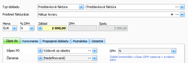 - % DPH je N a stĺpec PD vyberte konkrétny výdavok ovplyvňujúci základ dane v našom príklade Výdavok zásoby,