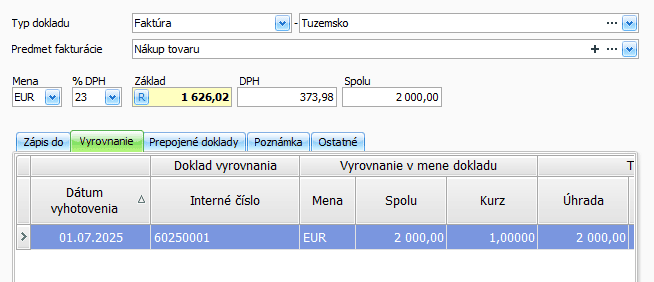 - Keďže faktúra už bola uhradená na základe preddavkovej faktúry v záložke Vyrovnanie pridajte úhradu ručne,