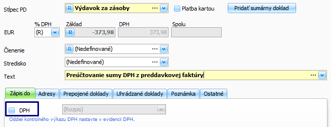 - v Zápis do voľbu DPH odznačte, a to z dôvodu, že suma DPH už bola uplatnená pri vystavení faktúry k prijatej platbe.