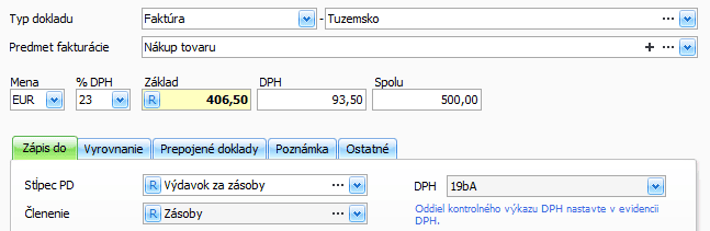 - vyplňte sumy s rozpisom na základ a DPH a stĺpec PD Výdavok za zásoby,