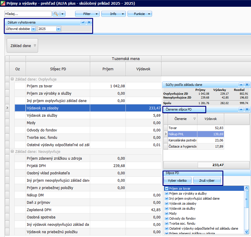 Prehľad Príjmy a výdavky obsahuje sumarizáciu príjmov a výdavkov zaúčtovaných v peňažnom denníku. Počas roka môžete kedykoľvek pozrieť, aký máte aktuálny stav príjmov a výdavkov a ich súčtov podľa základu dane.