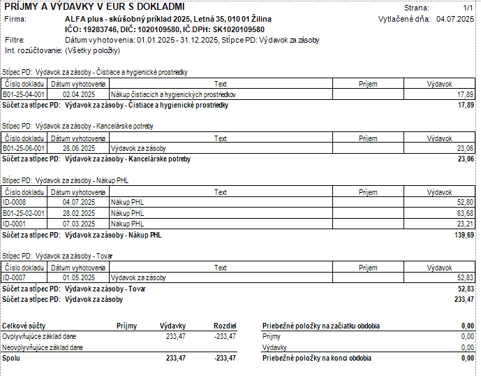 - V spodnej časti formulára zvoľte Tlač – Príjmy a výdavky s dokladmi.