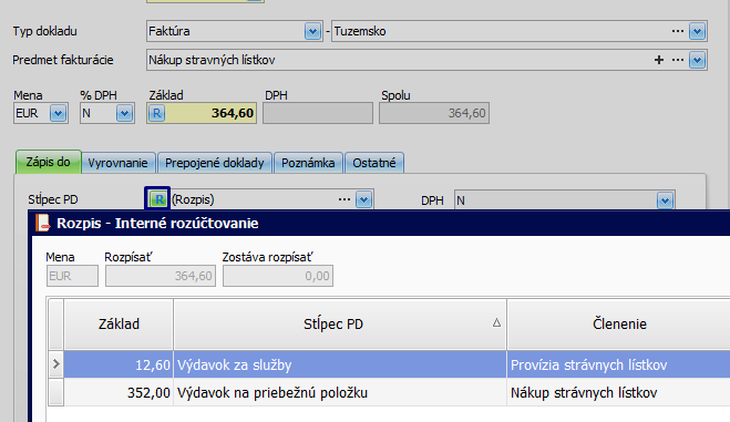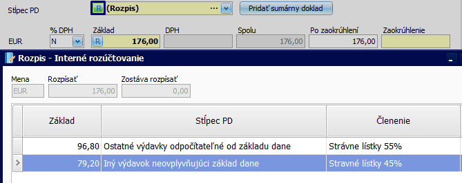 - Na záložke Zápis do, v poli Stĺpec PD, rozúčtujte sumu provízie a sumu za stravné lístky z pohľadu dane z príjmov. Tlačidlom Rozdeľ, rozdeľte sumu základu na dve položky,