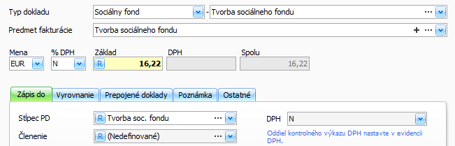 - v poli % DPH je N, doplňte sumu a stĺpec PD je Tvorba soc. fondu,