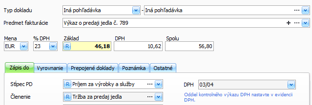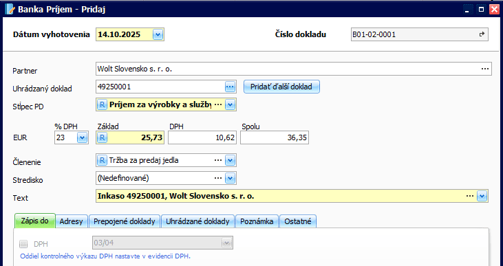 Podkladom na zaúčtovanie tržieb za predaj jedla budú výkaz o predaji a doklady vystavené zákazníkom spoločnosťou Wolt v mene Reštaurácie. Podľa zákona o DPH je platiteľ DPH povinný viesť podrobné DPH záznamy o dodaných tovaroch a službách za príslušné zdaňovacie obdobie (§ 70 ods. 1). Z tohto dôvodu odporúčame pri účtovaní pohľadávky uviesť do poľa Predmet fakturácie aj číselný odkaz na obdržané doklady.