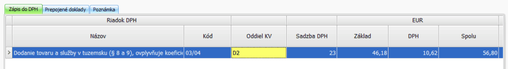 V časti Záznam DPH je doplnený Oddiel KV – D2 a suma smeruje do daňového priznania na riadkoch DPH – 03/04.