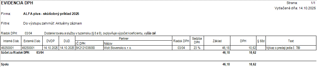 V ALFE plus sa z pohľadávky prenesie číselný odkaz na obdržané doklady z Predmetu fakturácie do záznamu DPH do časti Text. Podrobné záznamy DPH vytlačíme v evidencii DPH cez Tlač – Evidencia DPH.
