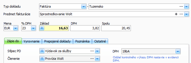 Stĺpec PD vyberieme Výdavok za služby a môžeme doplniť aj bližšie členenie výdavku – napr. Provízia Wolt.