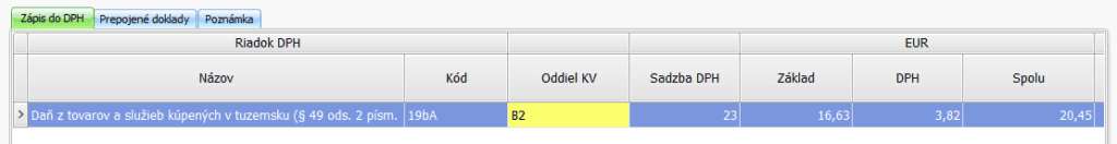V časti Záznam DPH je doplnený Oddiel KV – B2 a suma smeruje do daňového priznania na riadku DPH – 19bA.