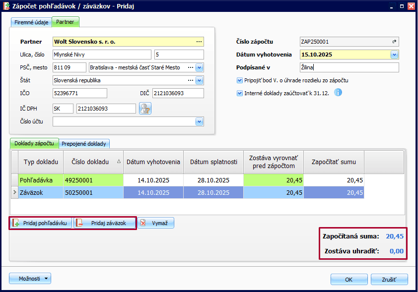 V spodnej časti formulára je zobrazená Započítaná suma (v našom prípade 20,45 eur) a suma, ktorá Zostáva uhradiť od partnera (v našom prípade 0 eur).