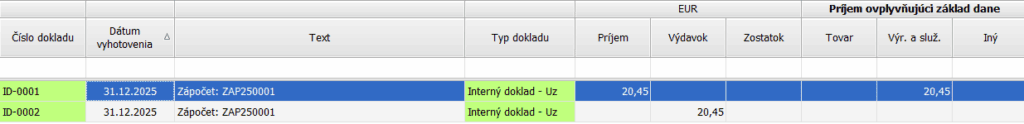 Peňažný denník – uzávierkové účtovné operácie – príjem zo započítanej pohľadávky ako príjem ovplyvňujúci základ dane z príjmov v členení Príjem za výrobky a služby v sume 20,45 eur, a zároveň výdavok zo započítaného záväzku ako výdavok ovplyvňujúci základ dane z príjmov v členení Služby v sume 20,45 eur.