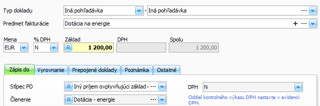 - % DPH vyberte N a sumu dotácie doplňte do Základu,