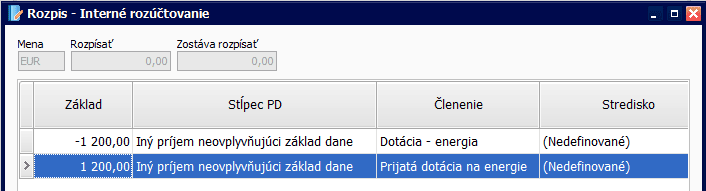 - Vo formulári Rozpis – Interné rozúčtovanie vyplňte prvú položku. V Základe vyplňte sumu použitej dotácie spolu. Sumu zaevidujte mínusom. Stĺpec PD vyberte Iný príjem neovplyvňujúci základ dane, doplňte prípadne členenie. Vyplnený formulár uložte.