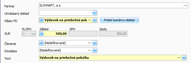 - stĺpec PD vyberte Výdavok na priebežnú položku a doplňte sumu 500 eur,