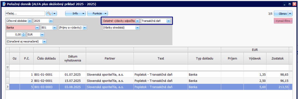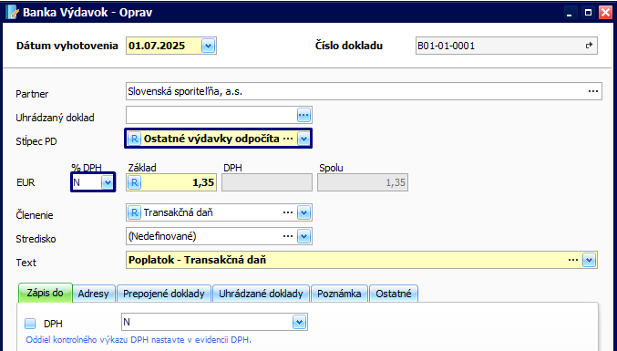 Pri účtovaní transakčnej dane v peňažnom denníku sa v časti Banka poplatok účtuje: