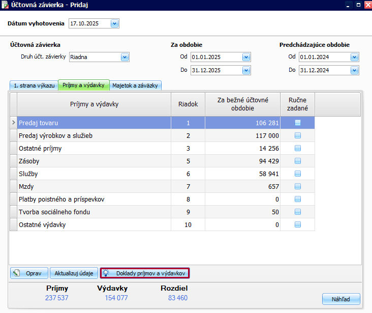 - cez tlačidlo Doklady príjmov a výdavkov skontrolujete z akých súm a dokladov sú údaje načítané.