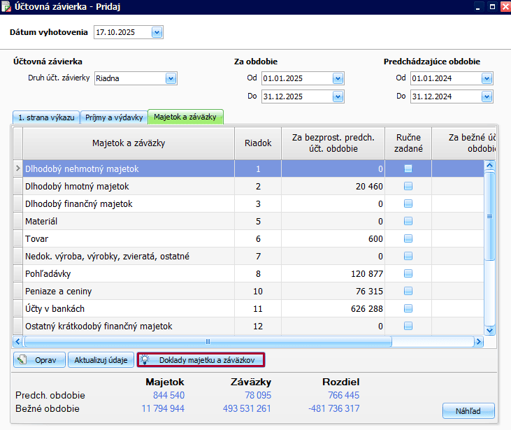 - kontrolu načítaných súm overíte tlačidlom Doklady majetku a záväzkov.