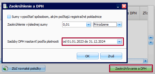 - sadzbu DPH platnú do 31.12.2024 nastavte cez tlačidlo Zaokrúhľovanie a DPH, kde vyberte Sadzby DPH nastaviť podľa platnosti od 01.01.2023 do 31.12.2024.