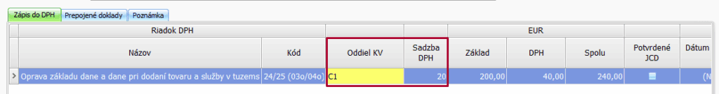 - V evidencii DPH je doplnený Oddiel KV – C1 a sadzba DPH, platná do 31.12.2024.