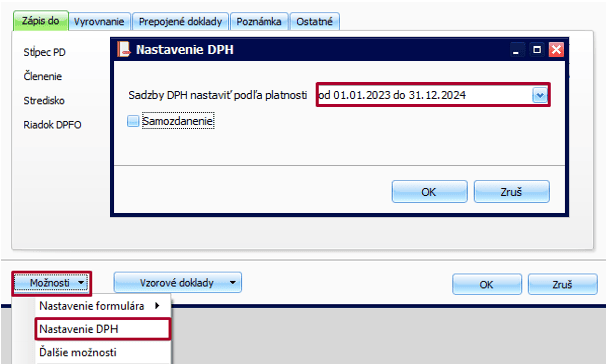 - sadzbu DPH platnú do 31.12.2024 nastavte cez Možnosti – Nastavenie DPH, kde vyberte Sadzby DPH nastaviť podľa platnosti od 01.01.2023 do 31.12.2024.