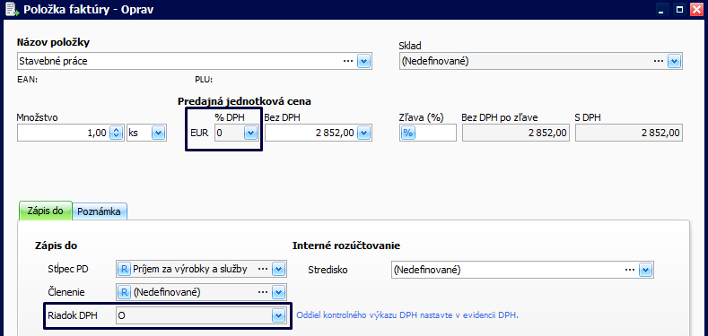 Dňa 15.07.2025 ste odberateľovi – tuzemskému platiteľovi DPH vystavili faktúru za stavebné práce s prenosom daňovej povinnosti. Suma faktúry je 2 852 eur.