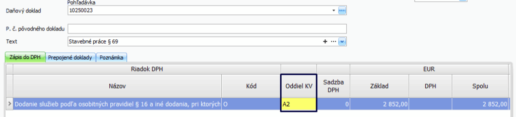 - Vo formulári evidencie DPH je doplnený oddiel KV A2, vyplnený formulár uložte.