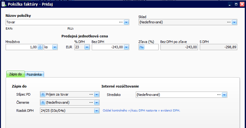 - Pridajte fakturovanú položku. Predajnú jednotkovú cenu uveďte mínusom.