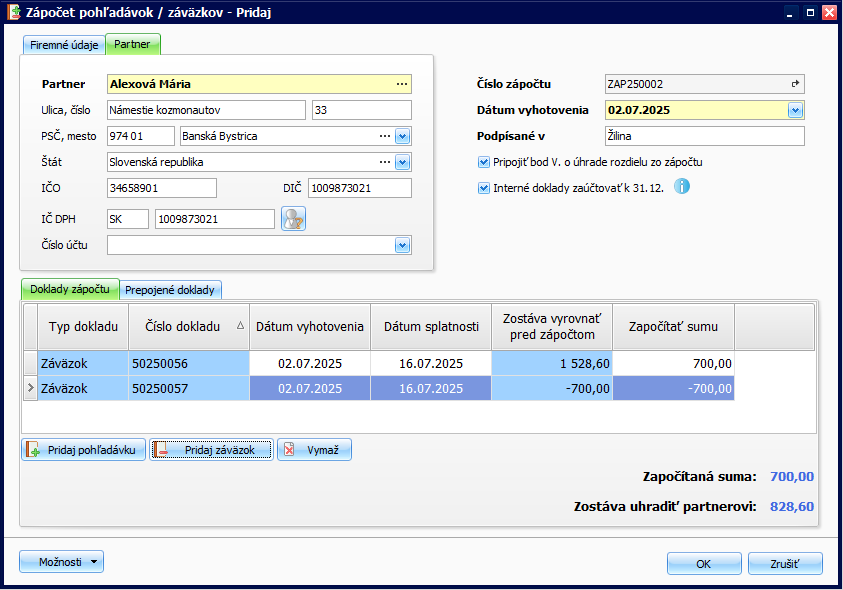 - vyberte partnera, s ktorým ste sa dohodli na zápočte dokladov,