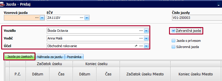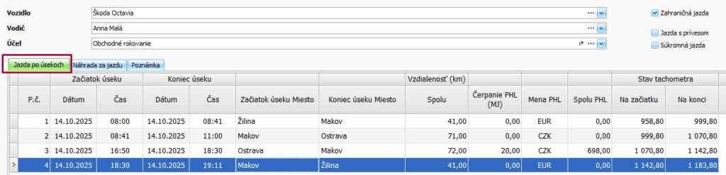 - zakliknite voľbu Zahraničná jazda, čím sa automaticky zobrazí záložka Jazda po úsekoch.