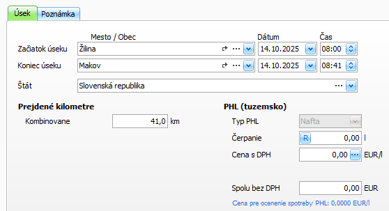 - počet Prejdených kilometrov program doplní automaticky zo systémovej databázy vzdialeností (v rámci SR), prípadne z vášho číselníka vzdialeností. Ak doplnený údaj nesúhlasí so skutočnosťou, opravte ho,